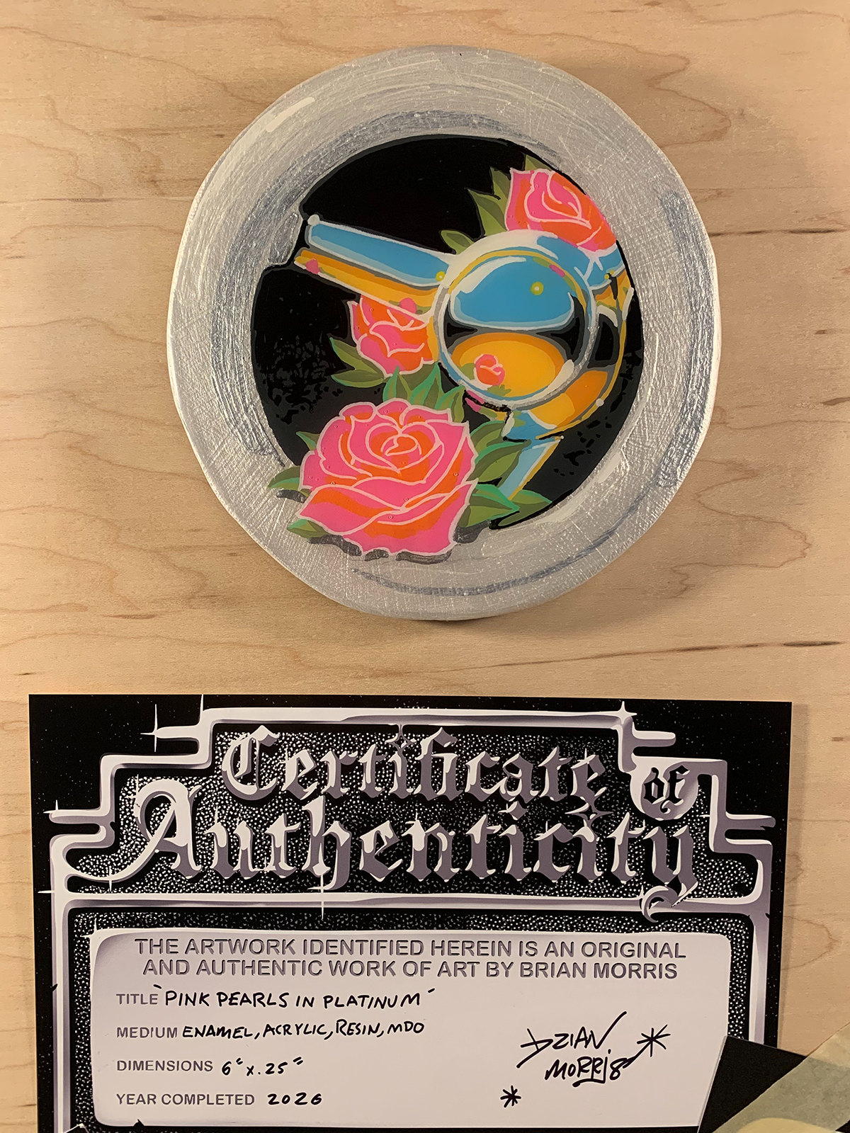 Enamel, acrylic, metalflake, and resin on signboard; 6" in diameter.